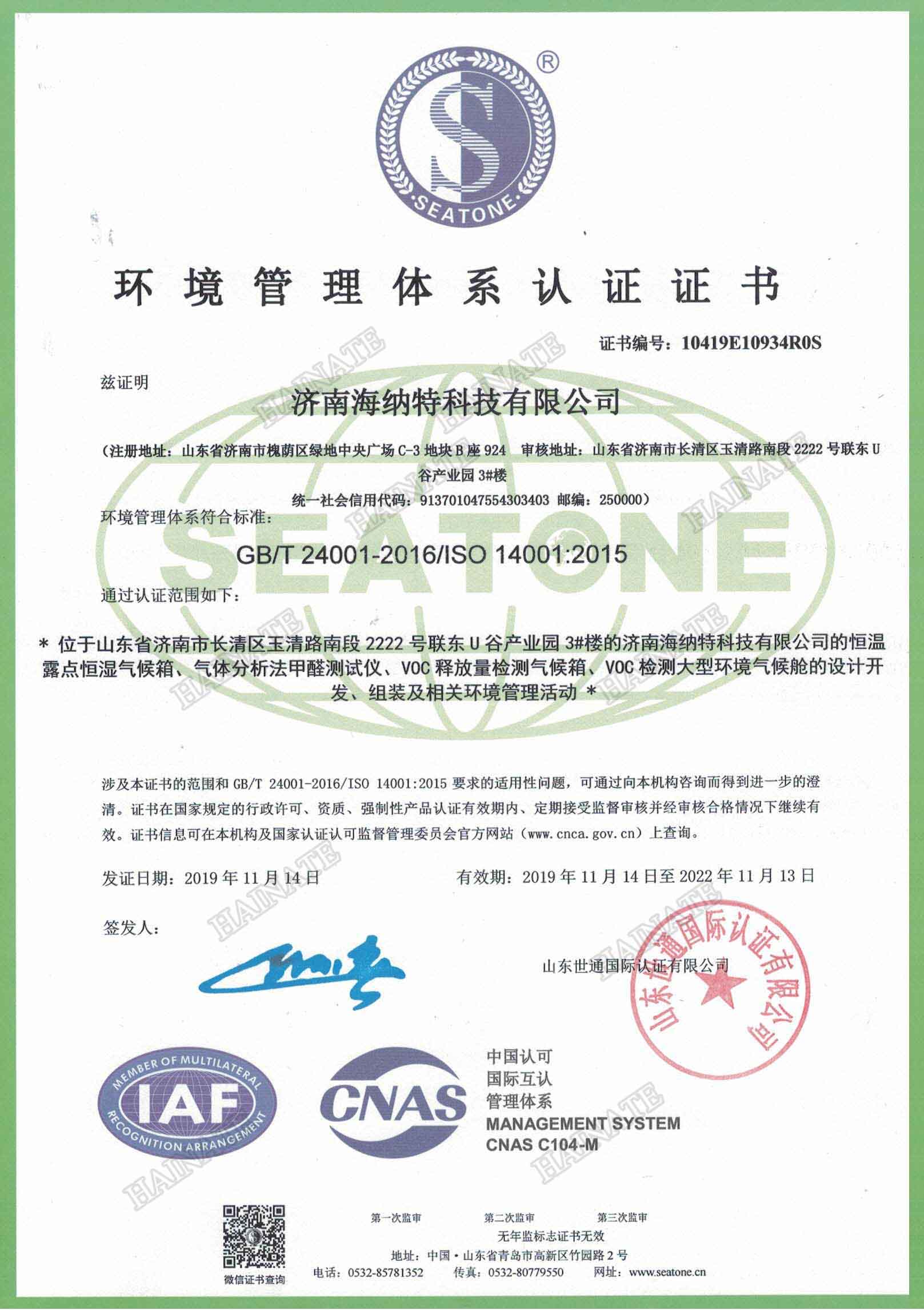 - 環境管理體系認證證書